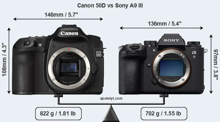 The physical size and weight of the Canon 50D and the Sony A9 III are illustrated in the side-by-side display below. The two cameras are presented according to their relative size. Three consecutive views from the front, the top, and the rear side are shown. All width, height and depth measures are rounded to the nearest millimeter.