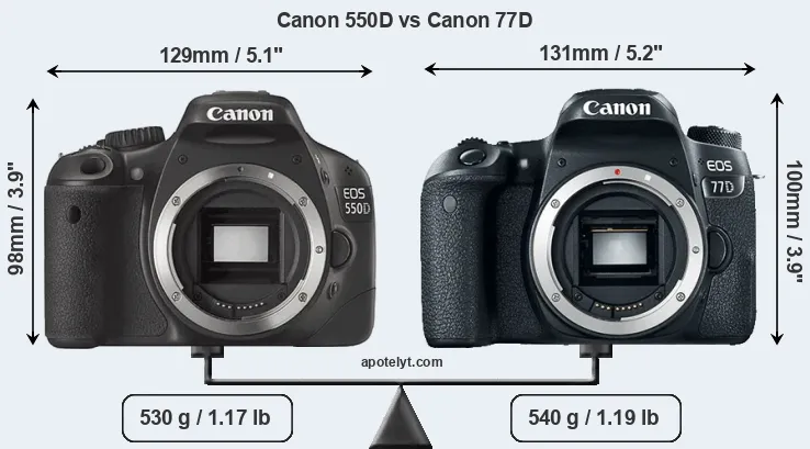 An illustration of the physical size and weight of the Canon 550D and the Canon 77D is provided in the side-by-side display below. The two cameras are presented according to their relative size. Three successive views from the front, the top, and the rear are shown. All width, height and depth dimensions are rounded to the nearest millimeter.