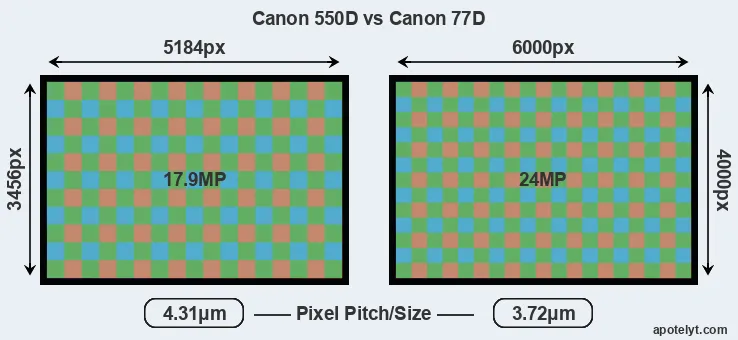While the two cameras under review share the same sensor size, the 77D offers a higher resolution of 24 megapixels, compared with 17.9 MP of the 550D. This megapixels advantage translates into a 16 percent gain in linear resolution. On the other hand, these sensor specs imply that the 77D has a higher pixel density and a smaller size of the individual pixel (with a pixel pitch of 3.72μm versus 4.31μm for the 550D). However, it should be noted that the 77D is much more recent (by 7 years) than the 550D, and its sensor will have benefitted from technological advances during this time that compensate for the smaller pixel size.