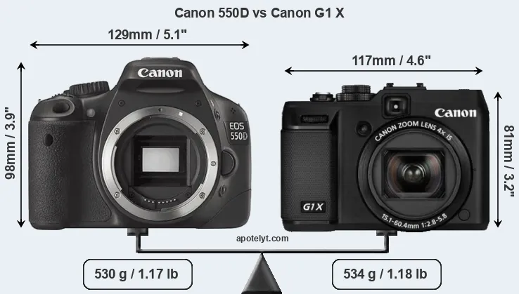 An illustration of the physical size and weight of the Canon 550D and the Canon G1 X is provided in the side-by-side display below. The two cameras are presented according to their relative size. Three successive views from the front, the top, and the rear are shown. All size dimensions are rounded to the nearest millimeter.
