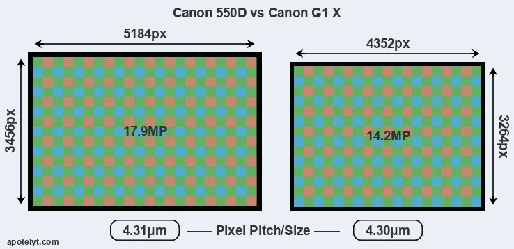 With 17.9MP, the 550D offers a higher resolution than the G1X (14.2MP), but the 550D nevertheless has marginally larger individual pixels (pixel pitch of 4.31μm versus 4.30μm for the G1X) due to its larger sensor. However, the G1X is a somewhat more recent model (by 1 year and 11 months) than the 550D, and its sensor might have benefitted from technological advances during this time that enhance the light gathering capacity of its pixels.