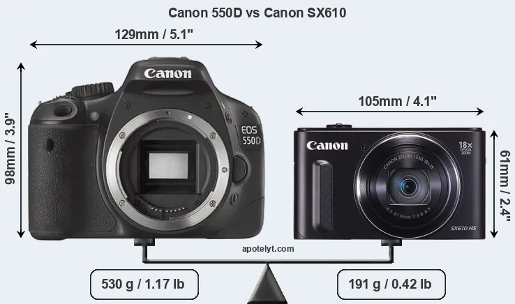 The side-by-side display below illustrates the physical size and weight of the Canon 550D and the Canon SX610. The two cameras are presented according to their relative size. Three consecutive perspectives from the front, the top, and the back are available. All width, height and depth measures are rounded to the nearest millimeter.