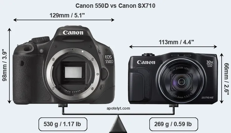 An illustration of the physical size and weight of the Canon 550D and the Canon SX710 is provided in the side-by-side display below. The two cameras are presented according to their relative size. Three consecutive views from the front, the top, and the rear side are shown. All size dimensions are rounded to the nearest millimeter.