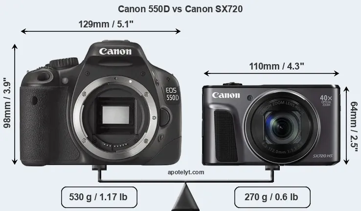 The side-by-side display below illustrates the physical size and weight of the Canon 550D and the Canon SX720. The two cameras are presented according to their relative size. Three consecutive perspectives from the front, the top, and the back are available. All width, height and depth measures are rounded to the nearest millimeter.