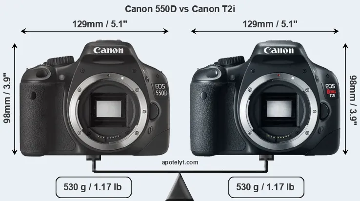 In this particular case, the Canon 550D and the Canon T2i have exactly the same width and height, and, thus, have identically-sized bodies. Moreover, the two cameras also share the same weight. In this context, it is worth noting that neither the 550D nor the T2i are weather-sealed.