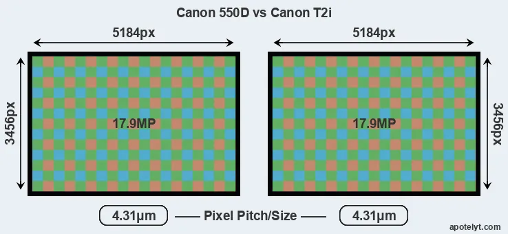 The two cameras under review do not only share the same sensor size, but also offer an identical resolution of 17.9 megapixels. This similarity in sensor specs implies that both the 550D and the T2i have the same pixel density, as well as the same pixel size. Moreover, the two cameras were released in close succession, so that their sensors are from the same technological generation.