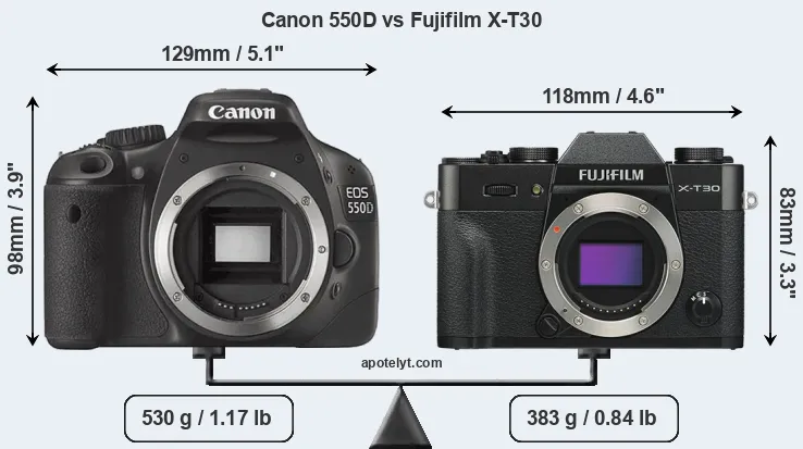 The physical size and weight of the Canon 550D and the Fujifilm X-T30 are illustrated in the side-by-side display below. The two cameras are presented according to their relative size. Three consecutive perspectives from the front, the top, and the back are available. All width, height and depth measures are rounded to the nearest millimeter.