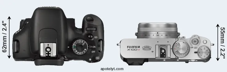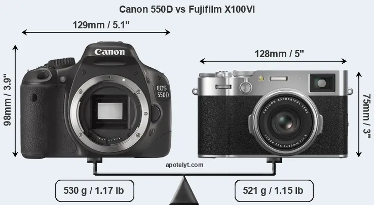 An illustration of the physical size and weight of the Canon 550D and the Fujifilm X100VI is provided in the side-by-side display below. The two cameras are presented according to their relative size. Three successive views from the front, the top, and the rear are shown. All width, height and depth dimensions are rounded to the nearest millimeter.