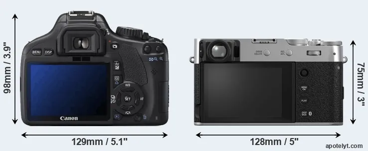 Going beyond this snapshot of core features and characteristics, what are the differences between the Canon EOS 550D and the Fujifilm X100VI? Which one should you buy? Read on to find out how these two cameras compare with respect to their body size, their imaging sensors, their shooting features, their input-output connections, and their reception by expert reviewers.
