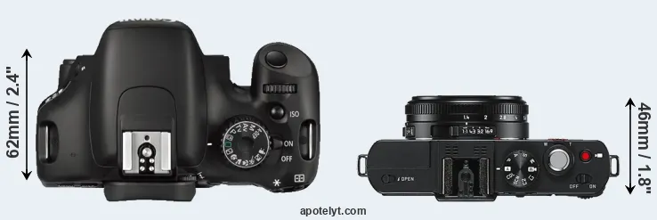 The side-by-side display below illustrates the physical size and weight of the Canon 550D and the Leica D-LUX 6. The two cameras are presented according to their relative size. Three consecutive perspectives from the front, the top, and the back are available. All width, height and depth measures are rounded to the nearest millimeter.