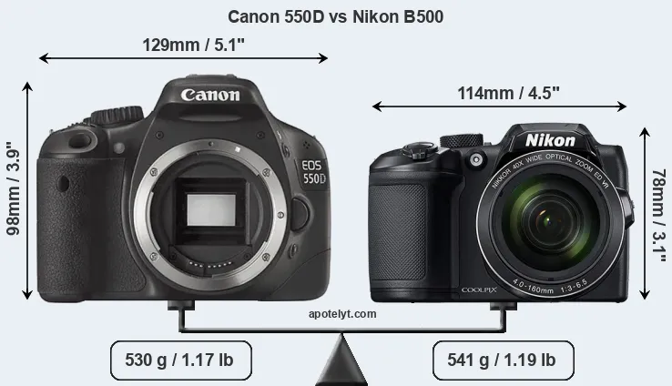 The physical size and weight of the Canon 550D and the Nikon B500 are illustrated in the side-by-side display below. The two cameras are presented according to their relative size. Three successive views from the front, the top, and the rear are shown. All width, height and depth measures are rounded to the nearest millimeter.