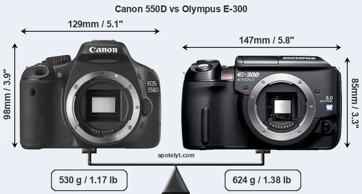 The side-by-side display below illustrates the physical size and weight of the Canon 550D and the Olympus E-300. The two cameras are presented according to their relative size. Three consecutive perspectives from the front, the top, and the back are available. All width, height and depth dimensions are rounded to the nearest millimeter.