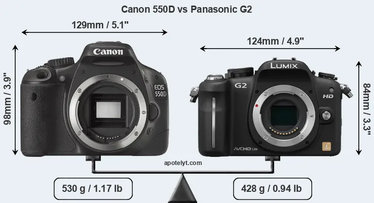 The side-by-side display below illustrates the physical size and weight of the Canon 550D and the Panasonic G2. The two cameras are presented according to their relative size. Three consecutive perspectives from the front, the top, and the back are available. All width, height and depth measures are rounded to the nearest millimeter.