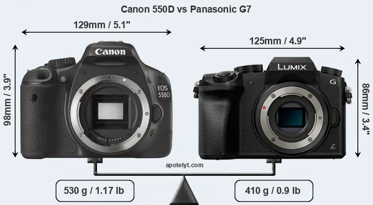 The physical size and weight of the Canon 550D and the Panasonic G7 are illustrated in the side-by-side display below. The two cameras are presented according to their relative size. Three successive views from the front, the top, and the rear are shown. All width, height and depth dimensions are rounded to the nearest millimeter.