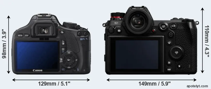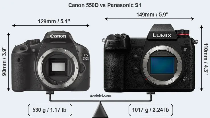 If the front view area (width x height) of the cameras is taken as an aggregate measure of their size, the Panasonic S1 is notably larger (30 percent) than the Canon 550D. Moreover, the S1 is substantially heavier (92 percent) than the 550D. It is noteworthy in this context that the S1 is splash and dust-proof, while the 550D does not feature any corresponding weather-sealing.