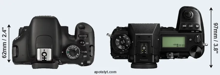 The physical size and weight of the Canon 550D and the Panasonic S1 are illustrated in the side-by-side display below. The two cameras are presented according to their relative size. Three consecutive views from the front, the top, and the rear side are shown. All size dimensions are rounded to the nearest millimeter.