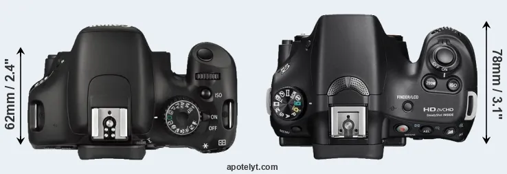 The physical size and weight of the Canon 550D and the Sony A58 are illustrated in the side-by-side display below. The two cameras are presented according to their relative size. Three successive views from the front, the top, and the rear are shown. All width, height and depth measures are rounded to the nearest millimeter.