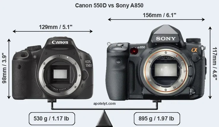 If the front view area (width x height) of the cameras is taken as an aggregate measure of their size, the Sony A850 is considerably larger (44 percent) than the Canon 550D. Moreover, the A850 is substantially heavier (69 percent) than the 550D. It is noteworthy in this context that the A850 is splash and dust-proof, while the 550D does not feature any corresponding weather-sealing.