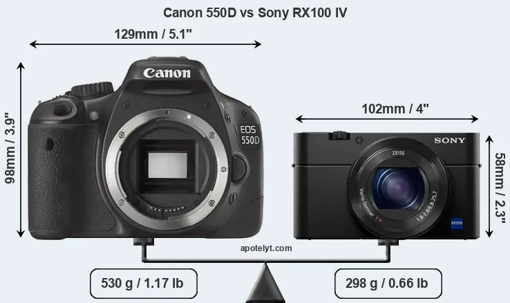 An illustration of the physical size and weight of the Canon 550D and the Sony RX100 IV is provided in the side-by-side display below. The two cameras are presented according to their relative size. Three consecutive perspectives from the front, the top, and the back are available. All width, height and depth measures are rounded to the nearest millimeter.