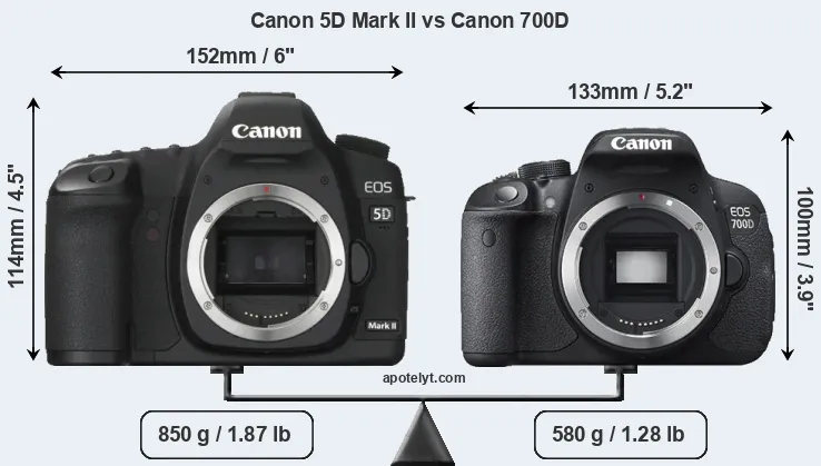 The side-by-side display below illustrates the physical size and weight of the Canon 5D Mark II and the Canon 700D. The two cameras are presented according to their relative size. Three successive views from the front, the top, and the rear are shown. All size dimensions are rounded to the nearest millimeter.