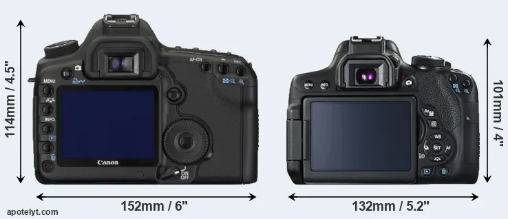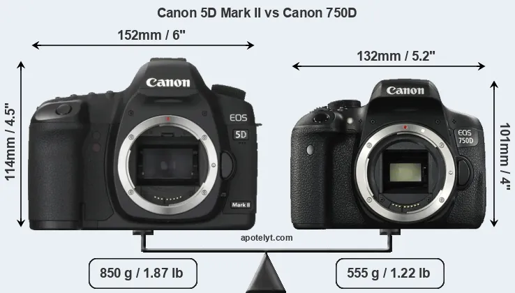 The side-by-side display below illustrates the physical size and weight of the Canon 5D Mark II and the Canon 750D. The two cameras are presented according to their relative size. Three consecutive views from the front, the top, and the rear side are shown. All width, height and depth dimensions are rounded to the nearest millimeter.