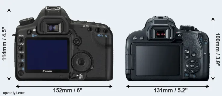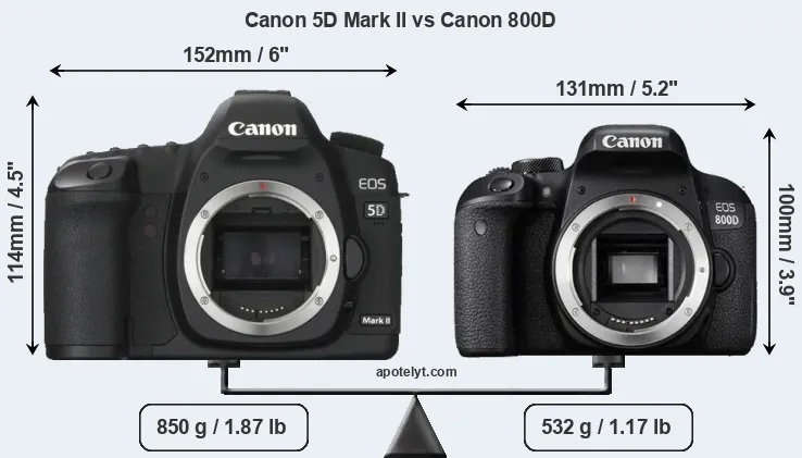 The physical size and weight of the Canon 5D Mark II and the Canon 800D are illustrated in the side-by-side display below. The two cameras are presented according to their relative size. Three consecutive perspectives from the front, the top, and the back are available. All width, height and depth dimensions are rounded to the nearest millimeter.