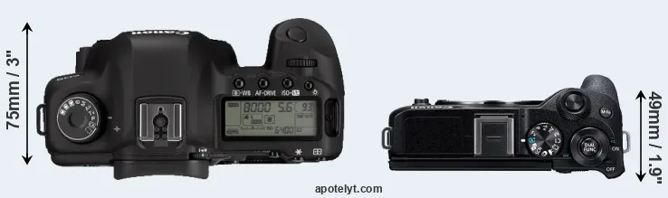The physical size and weight of the Canon 5D Mark II and the Canon M6 Mark II are illustrated in the side-by-side display below. The two cameras are presented according to their relative size. Three consecutive perspectives from the front, the top, and the back are available. All width, height and depth dimensions are rounded to the nearest millimeter.