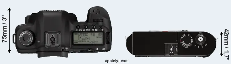 The side-by-side display below illustrates the physical size and weight of the Canon 5D Mark II and the Leica M Typ 262. The two cameras are presented according to their relative size. Three consecutive views from the front, the top, and the rear side are shown. All width, height and depth dimensions are rounded to the nearest millimeter.