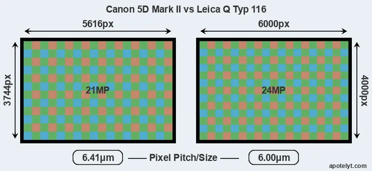 While the two cameras under review share the same sensor size, the Q Typ 116 offers a higher resolution of 24 megapixels, compared with 21 MP of the 5D Mark II. This megapixels advantage translates into a 7 percent gain in linear resolution. On the other hand, these sensor specs imply that the Q Typ 116 has a higher pixel density and a smaller size of the individual pixel (with a pixel pitch of 6.00μm versus 6.41μm for the 5D Mark II). However, it should be noted that the Q Typ 116 is much more recent (by 6 years and 8 months) than the 5D Mark II, and its sensor will have benefitted from technological advances during this time that compensate for the smaller pixel size.