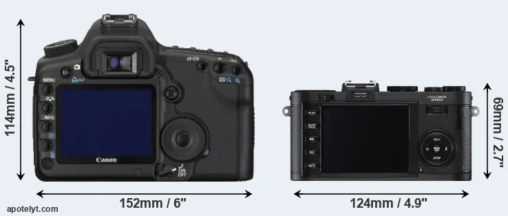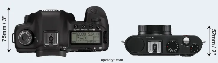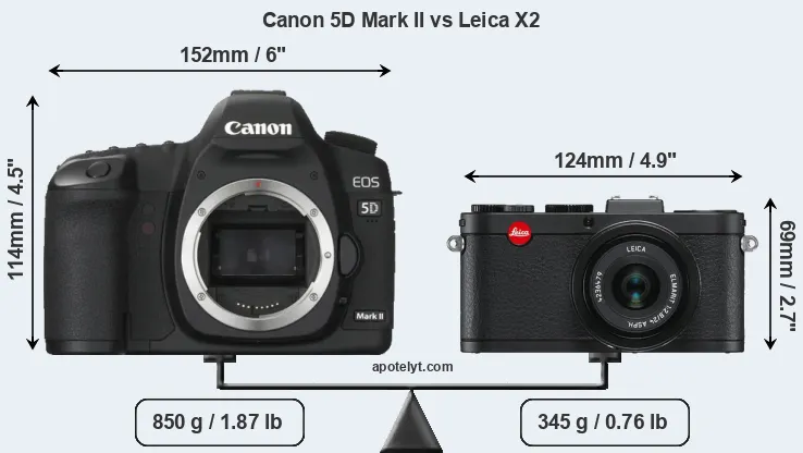 An illustration of the physical size and weight of the Canon 5D Mark II and the Leica X2 is provided in the side-by-side display below. The two cameras are presented according to their relative size. Three successive views from the front, the top, and the rear are shown. All width, height and depth dimensions are rounded to the nearest millimeter.