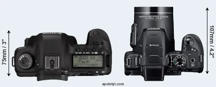 The side-by-side display below illustrates the physical size and weight of the Canon 5D Mark II and the Nikon B700. The two cameras are presented according to their relative size. Three consecutive perspectives from the front, the top, and the back are available. All size dimensions are rounded to the nearest millimeter.