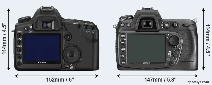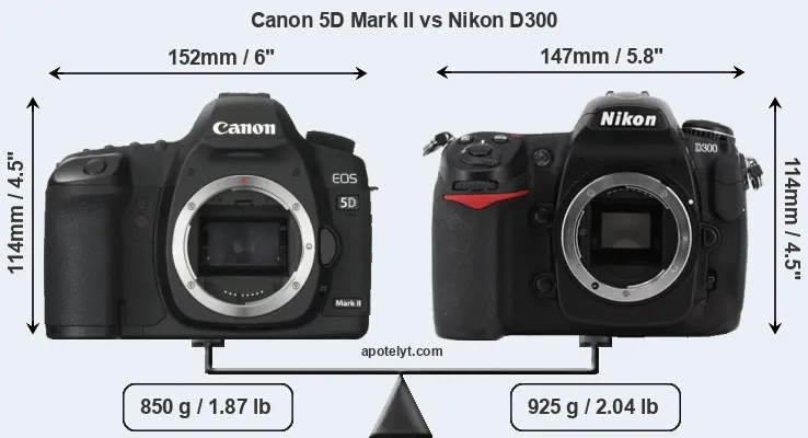 An illustration of the physical size and weight of the Canon 5D Mark II and the Nikon D300 is provided in the side-by-side display below. The two cameras are presented according to their relative size. Three successive views from the front, the top, and the rear are shown. All width, height and depth dimensions are rounded to the nearest millimeter.