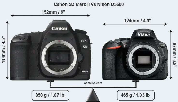 The physical size and weight of the Canon 5D Mark II and the Nikon D5600 are illustrated in the side-by-side display below. The two cameras are presented according to their relative size. Three successive views from the front, the top, and the rear are shown. All size dimensions are rounded to the nearest millimeter.