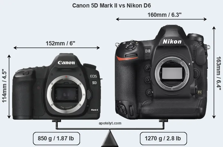 An illustration of the physical size and weight of the Canon 5D Mark II and the Nikon D6 is provided in the side-by-side display below. The two cameras are presented according to their relative size. Three consecutive views from the front, the top, and the rear side are shown. All width, height and depth dimensions are rounded to the nearest millimeter.
