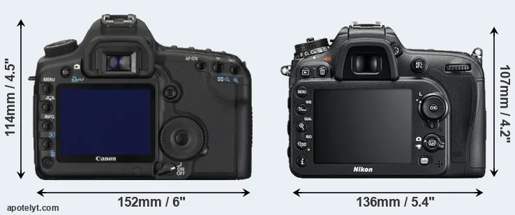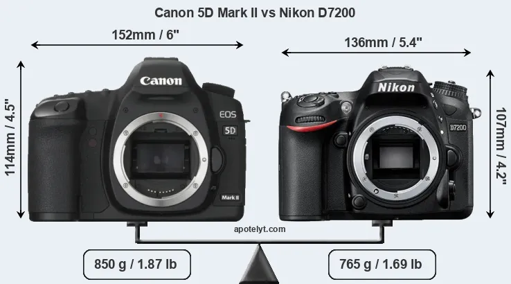An illustration of the physical size and weight of the Canon 5D Mark II and the Nikon D7200 is provided in the side-by-side display below. The two cameras are presented according to their relative size. Three successive views from the front, the top, and the rear are shown. All size dimensions are rounded to the nearest millimeter.
