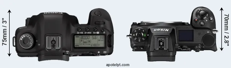 The side-by-side display below illustrates the physical size and weight of the Canon 5D Mark II and the Nikon Z6 II. The two cameras are presented according to their relative size. Three consecutive views from the front, the top, and the rear side are shown. All size dimensions are rounded to the nearest millimeter.