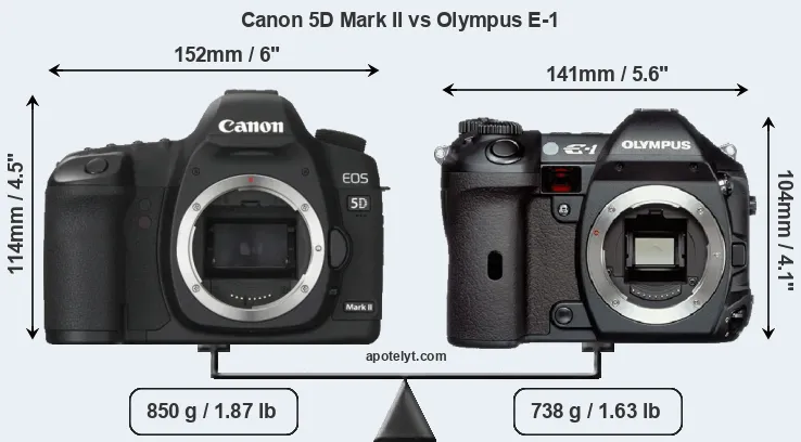 The physical size and weight of the Canon 5D Mark II and the Olympus E-1 are illustrated in the side-by-side display below. The two cameras are presented according to their relative size. Three consecutive perspectives from the front, the top, and the back are available. All width, height and depth dimensions are rounded to the nearest millimeter.