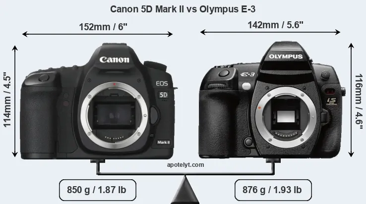 The side-by-side display below illustrates the physical size and weight of the Canon 5D Mark II and the Olympus E-3. The two cameras are presented according to their relative size. Three successive views from the front, the top, and the rear are shown. All width, height and depth dimensions are rounded to the nearest millimeter.