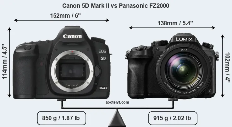 The side-by-side display below illustrates the physical size and weight of the Canon 5D Mark II and the Panasonic FZ2000. The two cameras are presented according to their relative size. Three consecutive views from the front, the top, and the rear side are shown. All width, height and depth dimensions are rounded to the nearest millimeter.