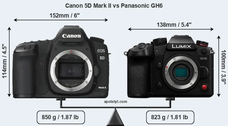 The side-by-side display below illustrates the physical size and weight of the Canon 5D Mark II and the Panasonic GH6. The two cameras are presented according to their relative size. Three consecutive perspectives from the front, the top, and the back are available. All size dimensions are rounded to the nearest millimeter.