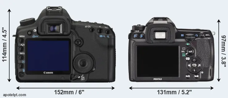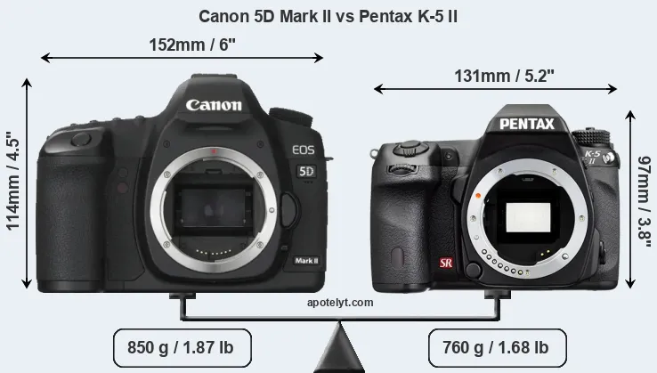 An illustration of the physical size and weight of the Canon 5D Mark II and the Pentax K-5 II is provided in the side-by-side display below. The two cameras are presented according to their relative size. Three successive views from the front, the top, and the rear are shown. All width, height and depth dimensions are rounded to the nearest millimeter.