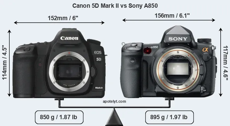 The side-by-side display below illustrates the physical size and weight of the Canon 5D Mark II and the Sony A850. The two cameras are presented according to their relative size. Three consecutive views from the front, the top, and the rear side are shown. All size dimensions are rounded to the nearest millimeter.