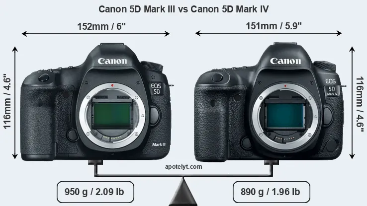 An illustration of the physical size and weight of the Canon 5D Mark III and the Canon 5D Mark IV is provided in the side-by-side display below. The two cameras are presented according to their relative size. Three successive views from the front, the top, and the rear are shown. All size dimensions are rounded to the nearest millimeter.