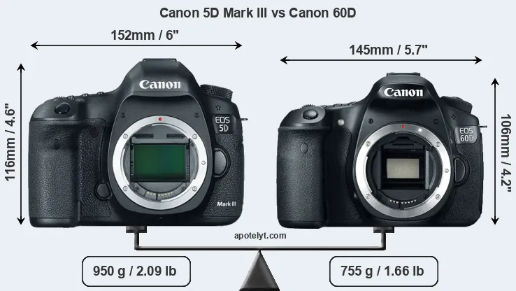 The physical size and weight of the Canon 5D Mark III and the Canon 60D are illustrated in the side-by-side display below. The two cameras are presented according to their relative size. Three consecutive views from the front, the top, and the rear side are shown. All width, height and depth dimensions are rounded to the nearest millimeter.