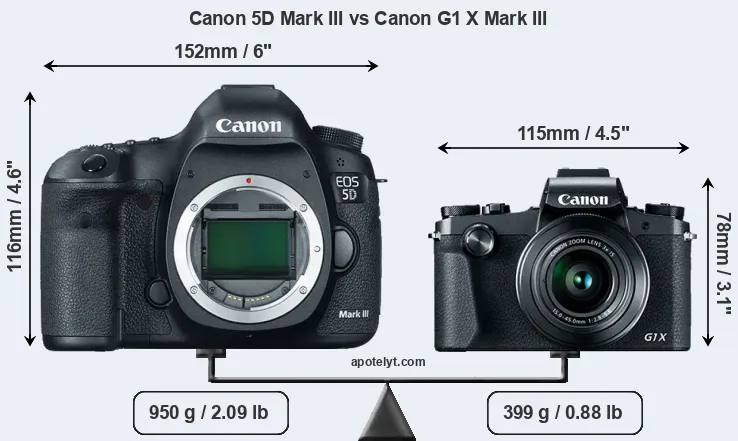 The side-by-side display below illustrates the physical size and weight of the Canon 5D Mark III and the Canon G1 X Mark III. The two cameras are presented according to their relative size. Three successive views from the front, the top, and the rear are shown. All size dimensions are rounded to the nearest millimeter.