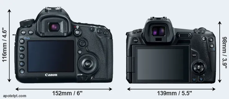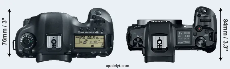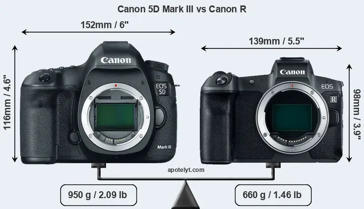 The physical size and weight of the Canon 5D Mark III and the Canon R are illustrated in the side-by-side display below. The two cameras are presented according to their relative size. Three successive views from the front, the top, and the rear are shown. All width, height and depth dimensions are rounded to the nearest millimeter.