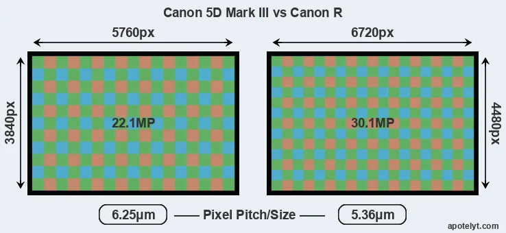 While the two cameras under review share the same sensor size, the Canon R offers a higher resolution of 30.1 megapixels, compared with 22.1 MP of the 5D Mark III. This megapixels advantage translates into a 17 percent gain in linear resolution. On the other hand, these sensor specs imply that the Canon R has a higher pixel density and a smaller size of the individual pixel (with a pixel pitch of 5.36μm versus 6.25μm for the 5D Mark III). However, it should be noted that the Canon R is much more recent (by 6 years and 6 months) than the 5D Mark III, and its sensor will have benefitted from technological advances during this time that compensate for the smaller pixel size.