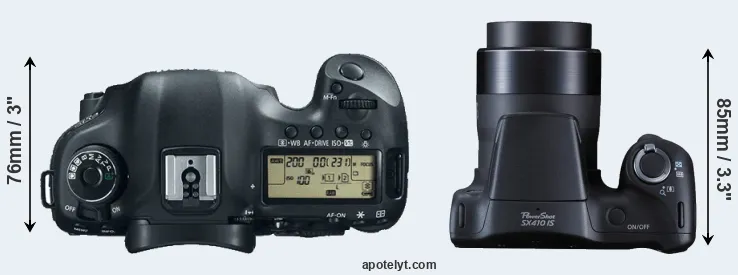 The side-by-side display below illustrates the physical size and weight of the Canon 5D Mark III and the Canon SX410. The two cameras are presented according to their relative size. Three consecutive perspectives from the front, the top, and the back are available. All width, height and depth dimensions are rounded to the nearest millimeter.