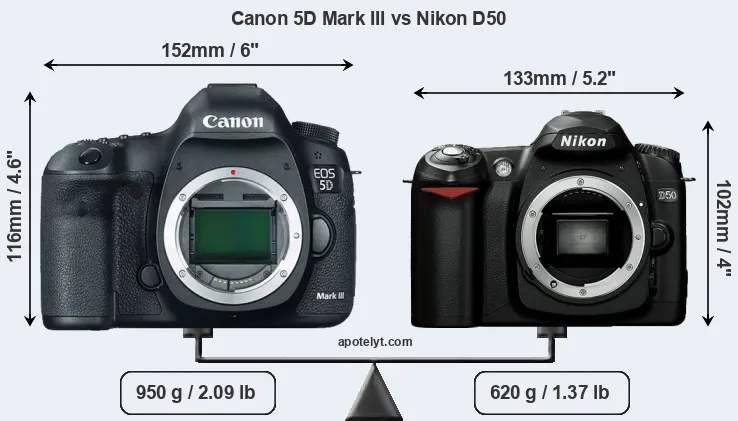The side-by-side display below illustrates the physical size and weight of the Canon 5D Mark III and the Nikon D50. The two cameras are presented according to their relative size. Three consecutive perspectives from the front, the top, and the back are available. All width, height and depth measures are rounded to the nearest millimeter.