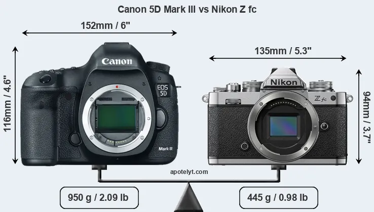 The physical size and weight of the Canon 5D Mark III and the Nikon Z fc are illustrated in the side-by-side display below. The two cameras are presented according to their relative size. Three consecutive views from the front, the top, and the rear side are shown. All size dimensions are rounded to the nearest millimeter.